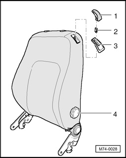- Pry off operating mechanism - 1 - of backrest release and securing clip - 2 -, unclip upper trim - 3 - and remove upward.