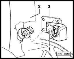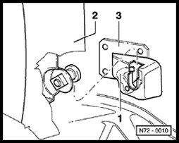 - Press back lugs - 1 - on left and right using a screwdriver and remove backrest - 2 upward from backrest mount - 3 -.