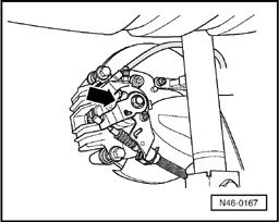 - Parking brake lever in "rest/off" position. Tighten adjusting nut until lever - arrow - lifts off the brake caliper stop.