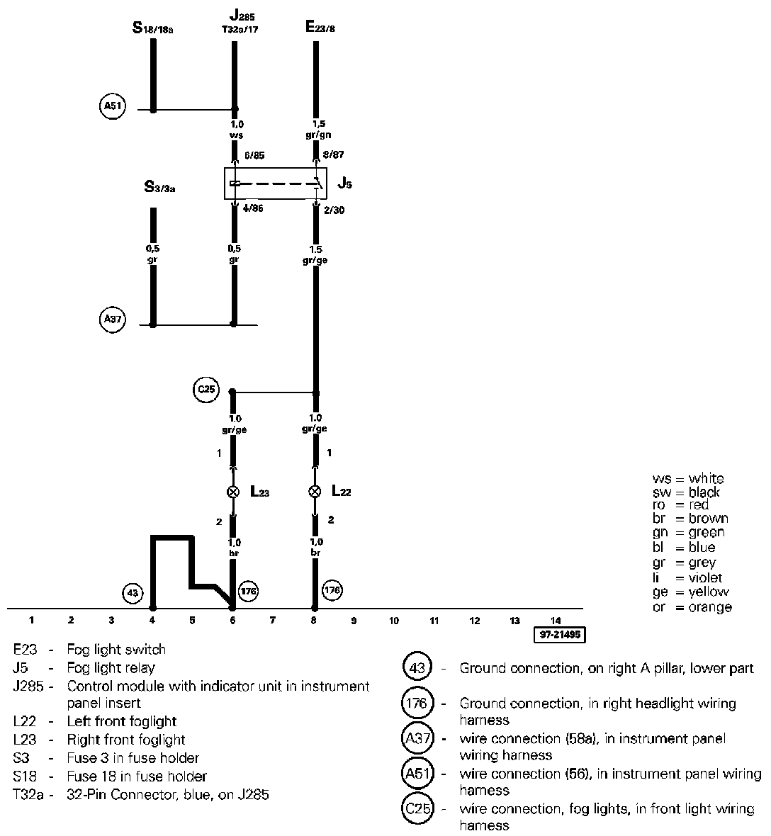 Fuse Identification: Starting with fuse 23, fuses in the fuse holder are identified with an additional numeral 2 added to the number when shown in the wiring diagram (i.e. fuse 23 in the vehicle becomes 223 in the diagrams, fuse 24 becomes 224, and so on).