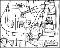 - Pull fuel supply line - 1 - and fuel return line - 2 - off fuel rail.