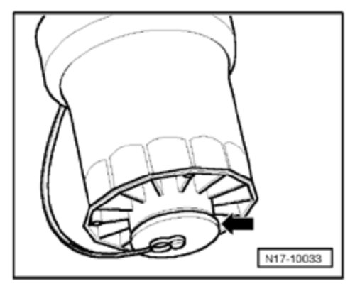 - Loosen sealing cap -arrow- e.g. using ring wrench AF 36 or using socket insert AF 36 T10125.