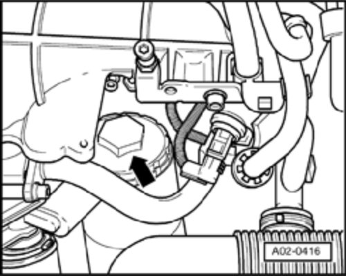 - Loosen oil filter -arrow- from below using tension strap or oil filter wrench VAS 3417 as an aid.