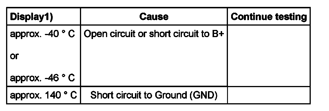 1) If a temperature is indicated which is below the ambient temperature of sensor, first check sensor wires for contact resistance. Note that while the vehicle is standing still the sensor might warm up due to radiant heat.
