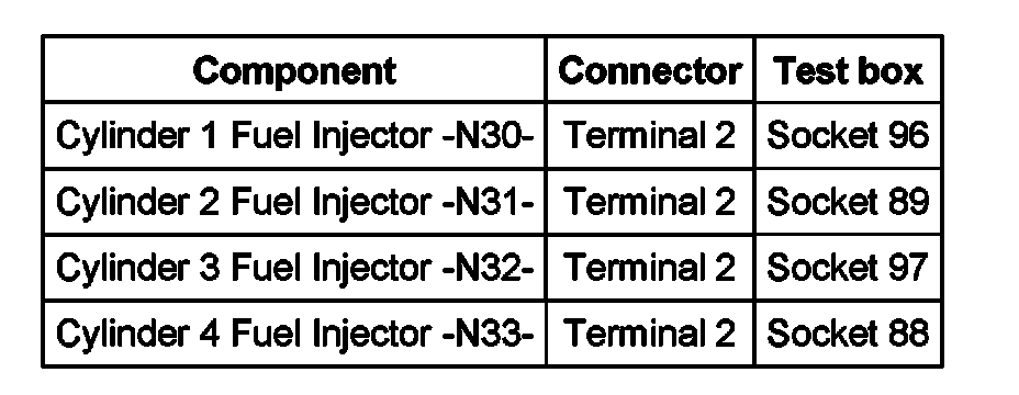 - The respective fuses of fuel injectors (-N30- to -N33-) must be OK.