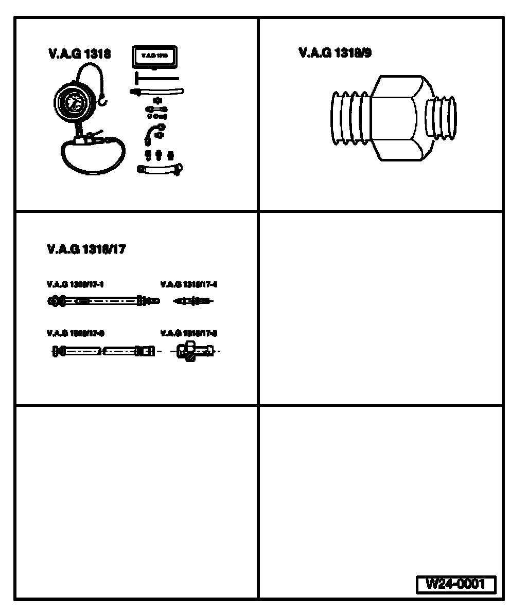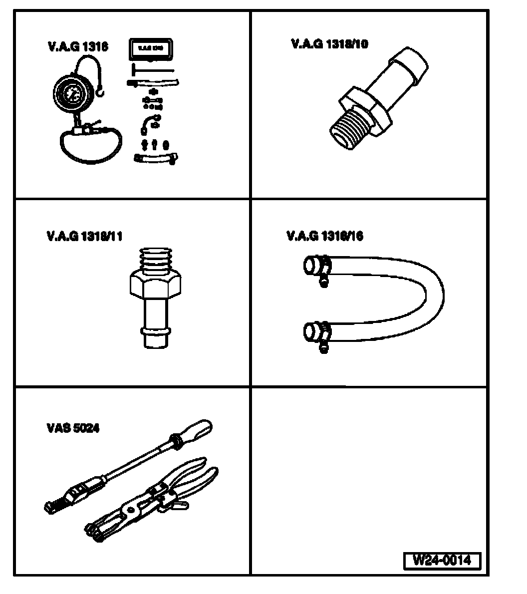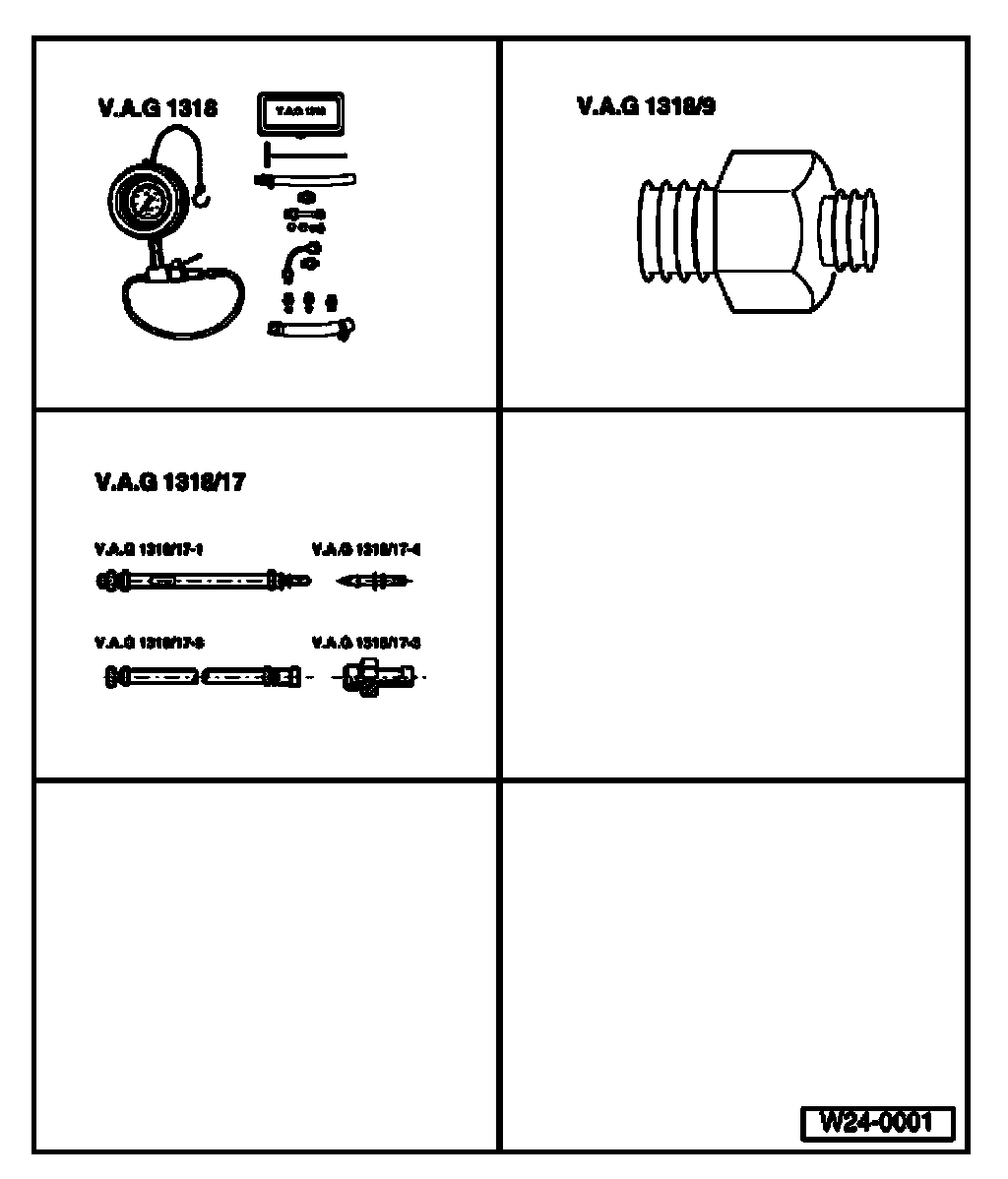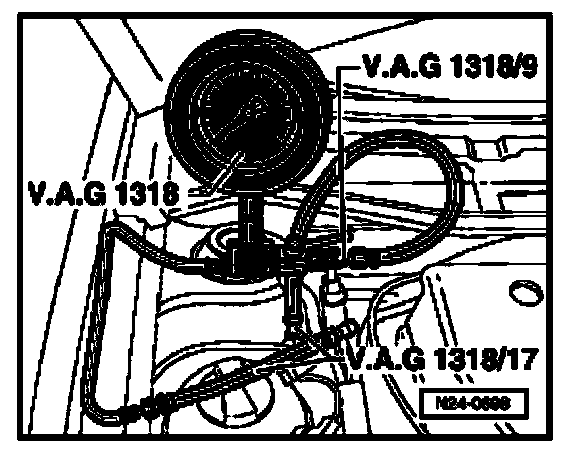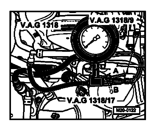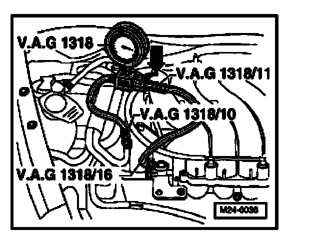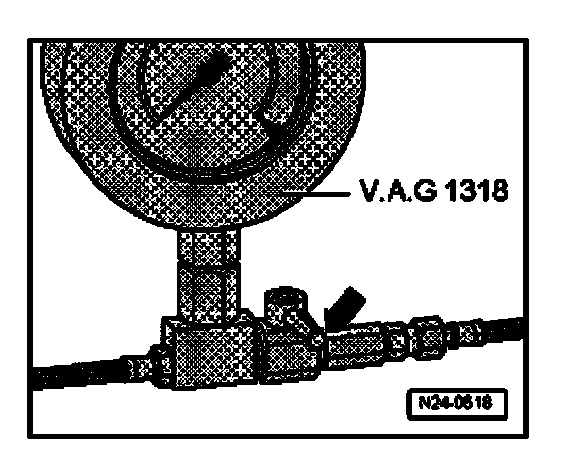 - Connect pressure gauge to adapter (V.A.G1318/10) at supply hose and to adapter (V.A.G1318/11) and hose adapter (V.A.G1318/16) at supply line.
