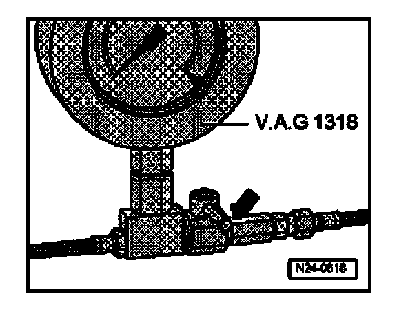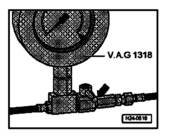 - Wait until pressure has built up, and then switch off ignition. Simultaneously close shut-off valve of (V.A.G 1318) pressure gauge (lever perpendicular to direction of flow (arrow)).
