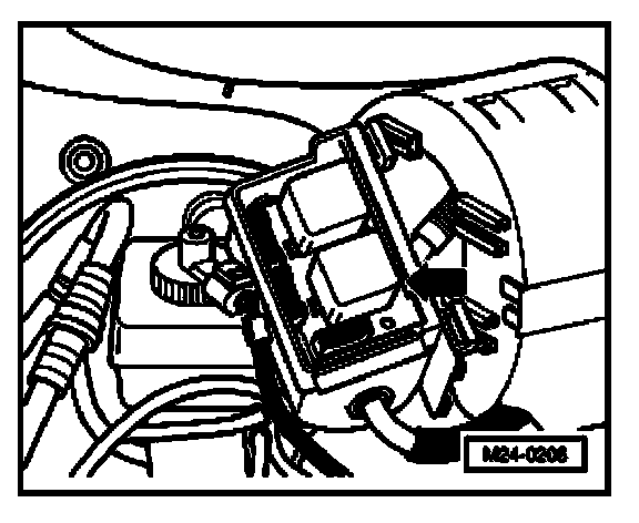 The Secondary Air Injection (AIR) pump relay -J299- - arrow - is located in the protective housing for relays and fuses in the engine compartment (inserted into the cable guide next to the brake master cylinder).