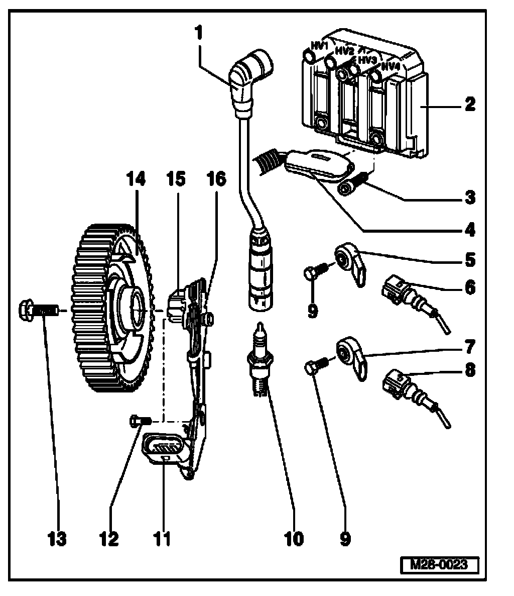 Ignition System Components, Assembly Overview (Engine codes AVH, AZG, BEV, BGD)