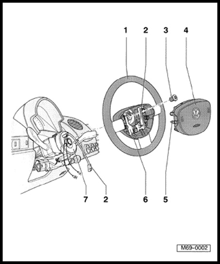 - Insert airbag unit - 4 - after connecting harness connector - 2 - into steering wheel - 1 - and push downward until catches - 5 - engage.