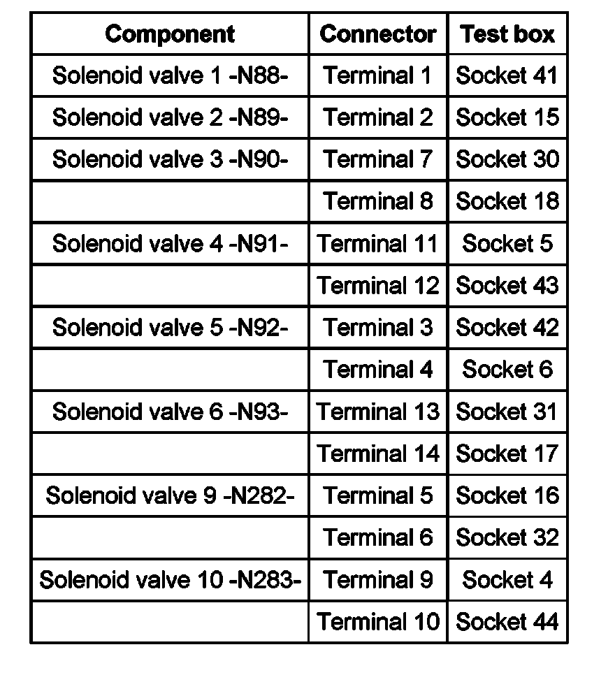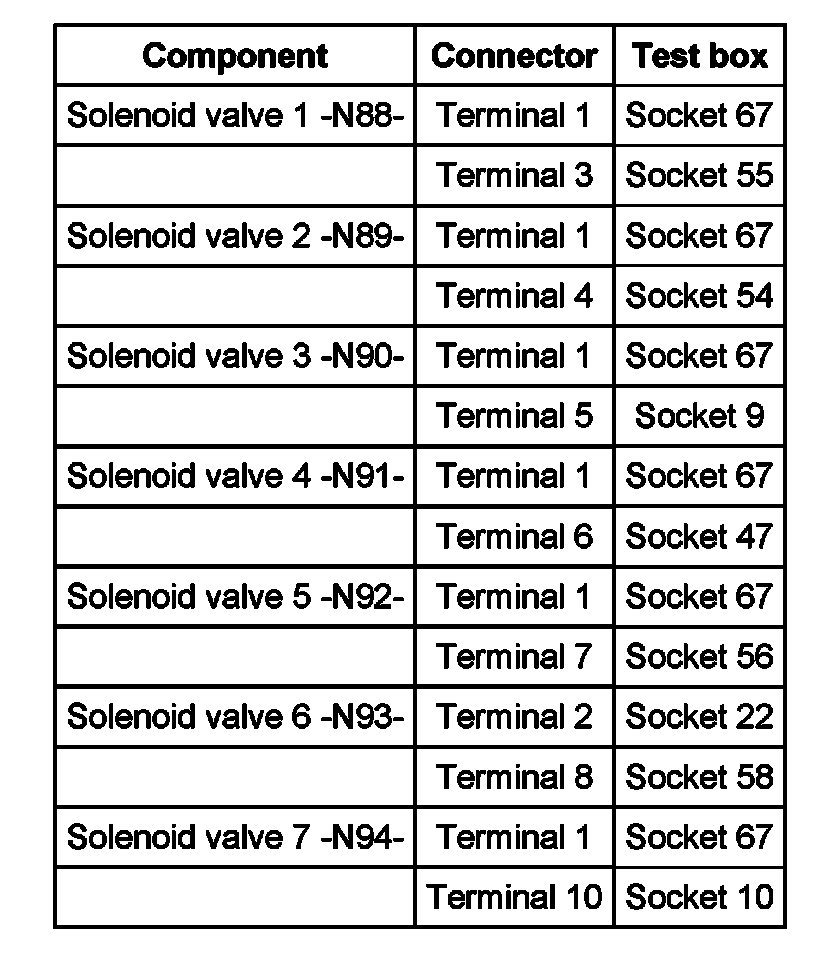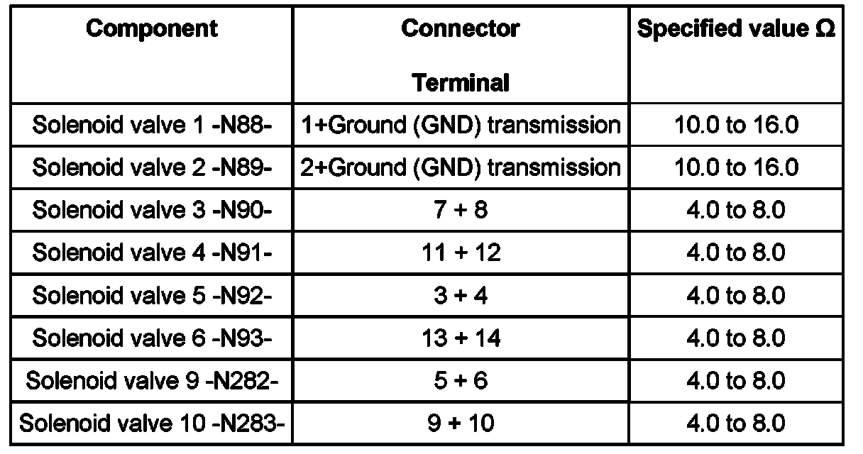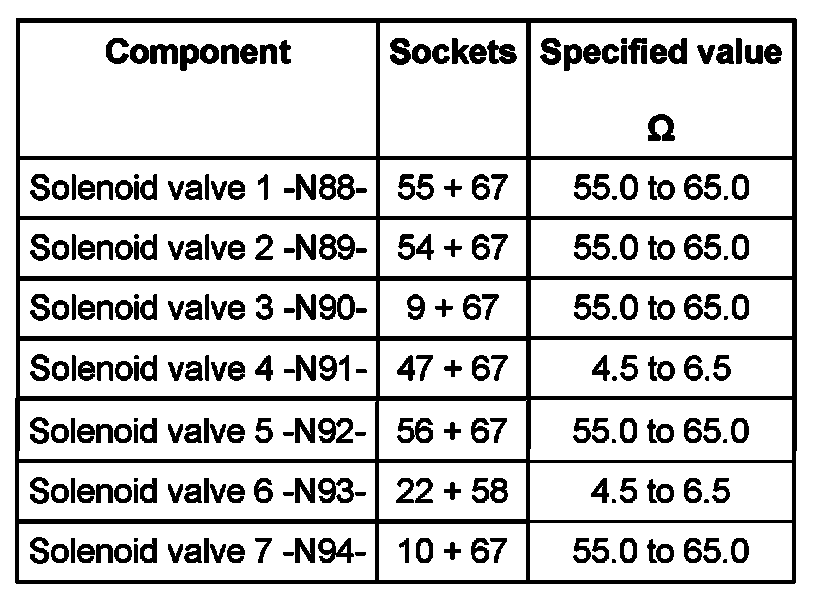 - Check resistances of solenoid valves at connector to solenoid valves: