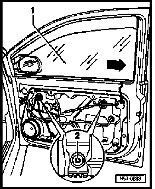 - Push door window -1- into window guide -arrow- and tighten clamps with bolts/screws -2- (10 Nm).