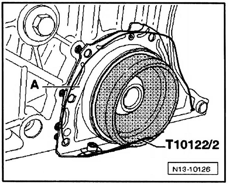- Position the sealing flange -A- with the assembly sleeve -T10122/2- on the crankshaft and slide the sealing flange onto the crankshaft pin.