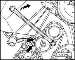 - Swing tensioning roller at hex-bolt in direction of arrow and lay ribbed belt onto belt pulley for power steering pump.