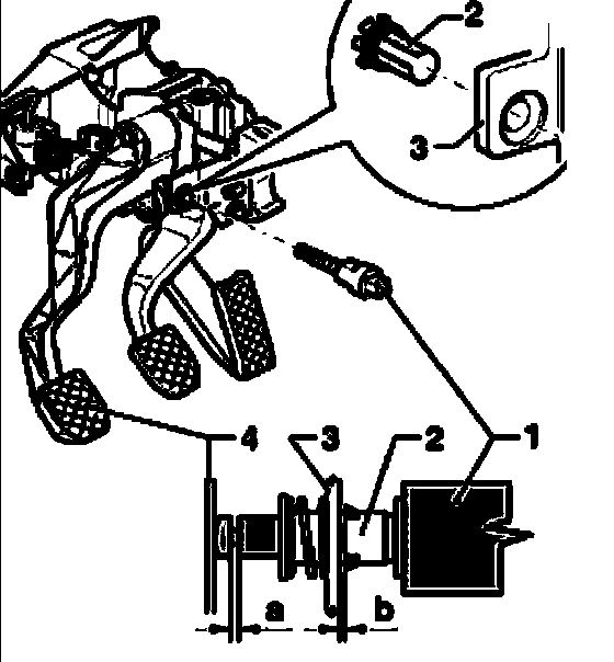 ^ Check adjustment of switch - 1 - above clutch pedal as follows: