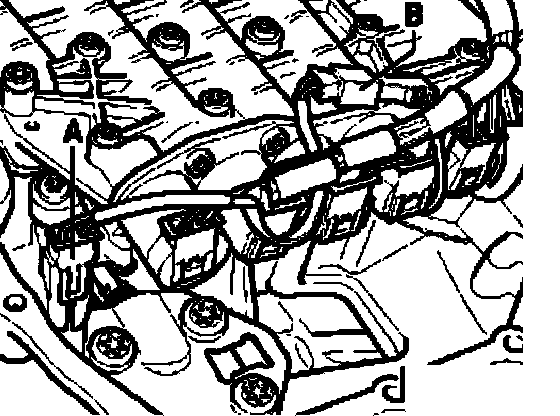 - Connect connector in transmission housing with flat part -arrow A- facing toward oil pan.