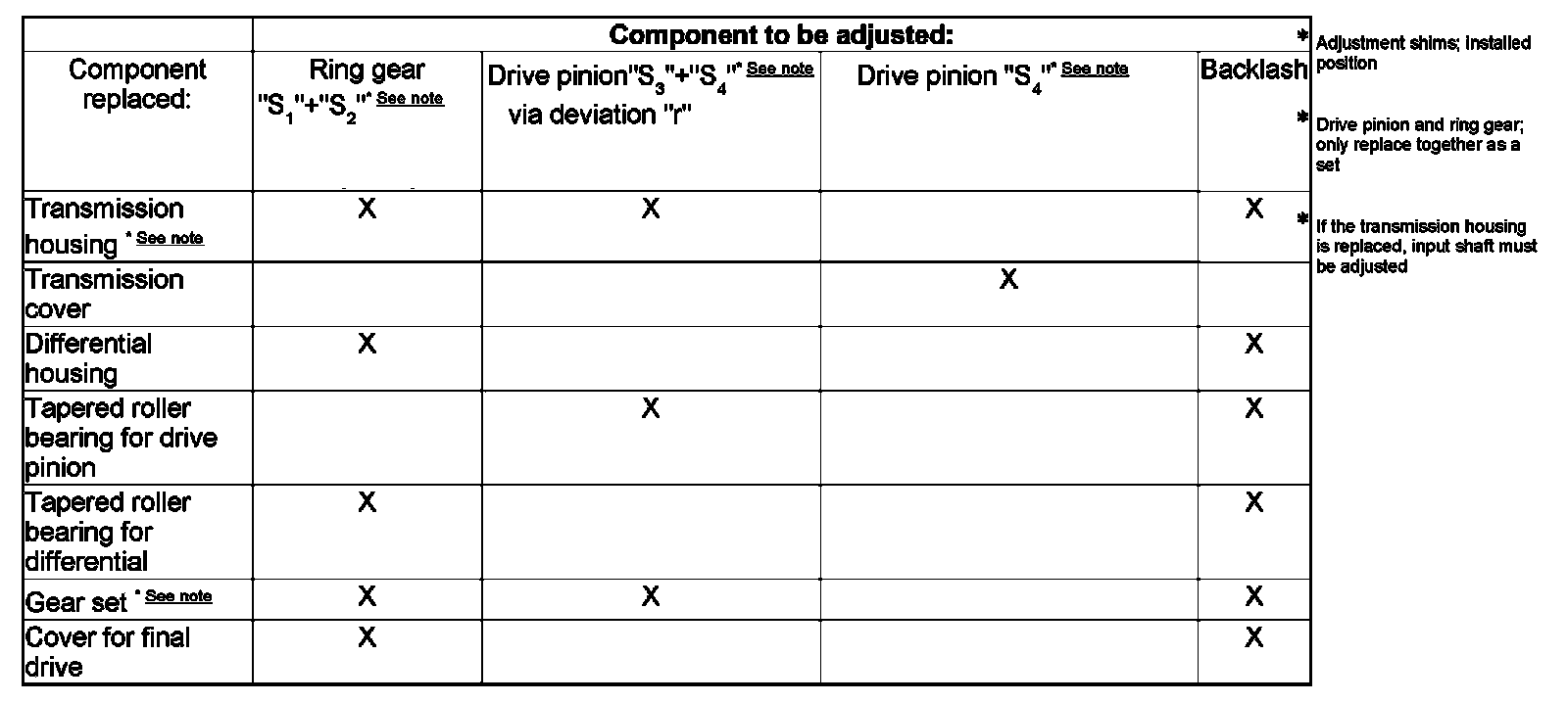 ^ When working on transmission, drive pinion or gear set only need to be adjusted if components were replaced which directly influence the final drive. Note the follow table to prevent unnecessary adjustments: