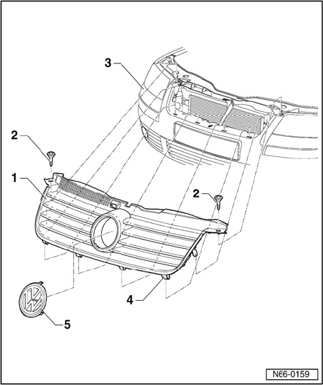 - Remove bolts - 2 -. Remove radiator grille - 1 - upward out of catches - 4 - of cover - 3 -.