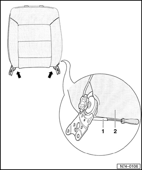 - Pull tension wires - 1 - out of backrest frame - 2 -.