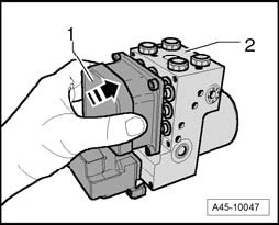 - Without twisting, carefully insert control module - 1 - onto hydraulic unit/valves - 2 - in direction of - arrow -.