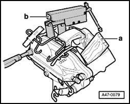 ^ Only one piston at a time can be forced out. When doing this hold the other piston in the caliper using the piston resetting tool - b -.
