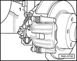 - Pull out securing clip - 1 - and unhook parking brake cable from brake caliper.