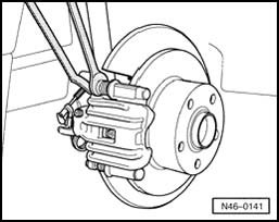 - Remove brake caliper housing and secure with wire so that the weight of the brake caliper does not stress or damage the brake hose.