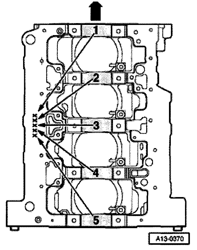 The letters marked on the lower sealing surface of the cylinder block identify which bearing thickness must to be installed in which location.