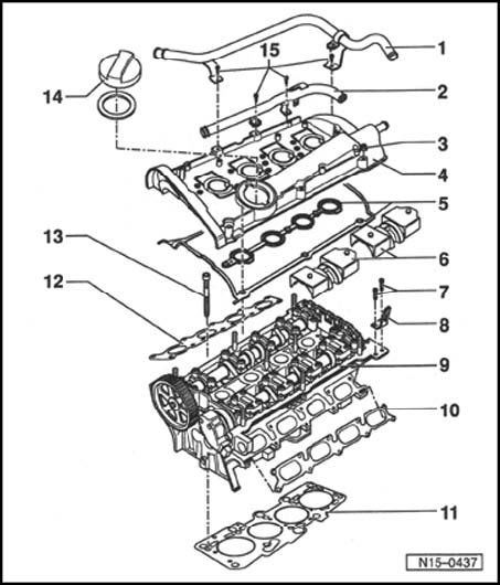 ^ Before installing, coat sealing contact surfaces between bearing cap and cylinder head with D 454 300 A2 and