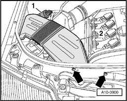 - Remove both screws - arrow - for air duct - 2 -.