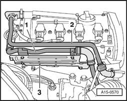 - Remove line - 1 - on secondary air combination valve on cylinder head cover and heat shield - 3 -.