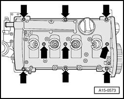 - Loosen nuts - arrows - on cylinder head cover and remove cylinder head cover.