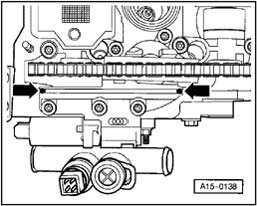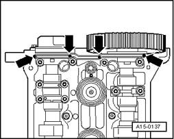 - Apply a small quantity of sealant AMV 174 004 01 to sides of joints - arrows - on upper sealing surface of cylinder head.