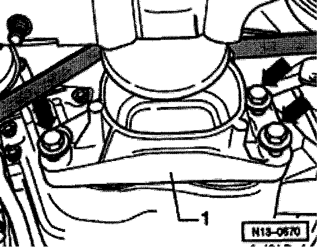 - Loosen rear bolt -2- for right transmission mount a few turns and remove front bolt -1 for right transmission mount.