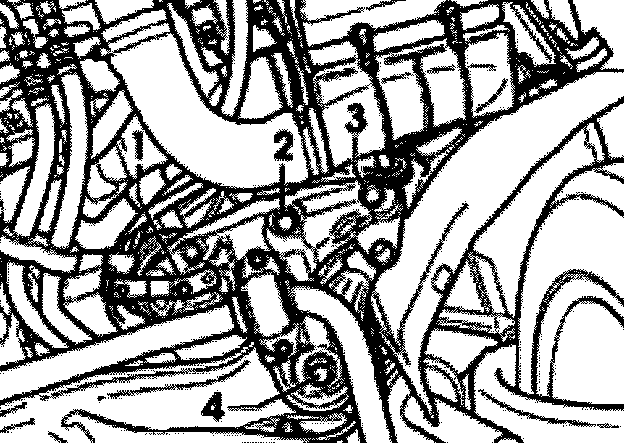 - First remove front bolts -2- and -3 from left and right sides of subframe. Then remove bolt-4-.
