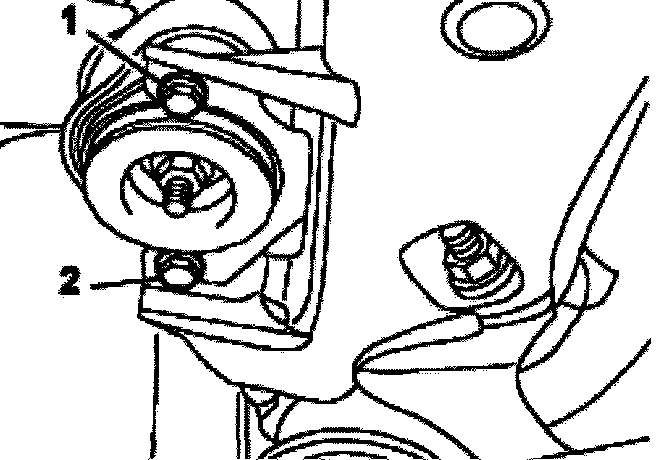 - Loosen rear bolt -2- for left transmission mount a few turns and remove front bolt -1 for left transmission mount.