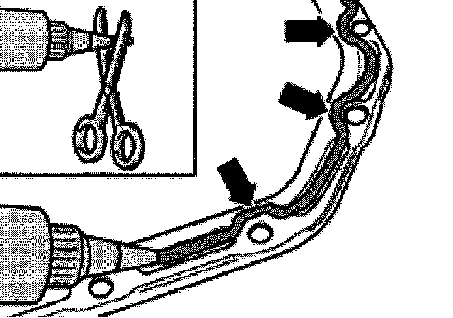 - Apply silicon sealant to clean sealing surfaces of oil pan as shown. Sealant bead must:
