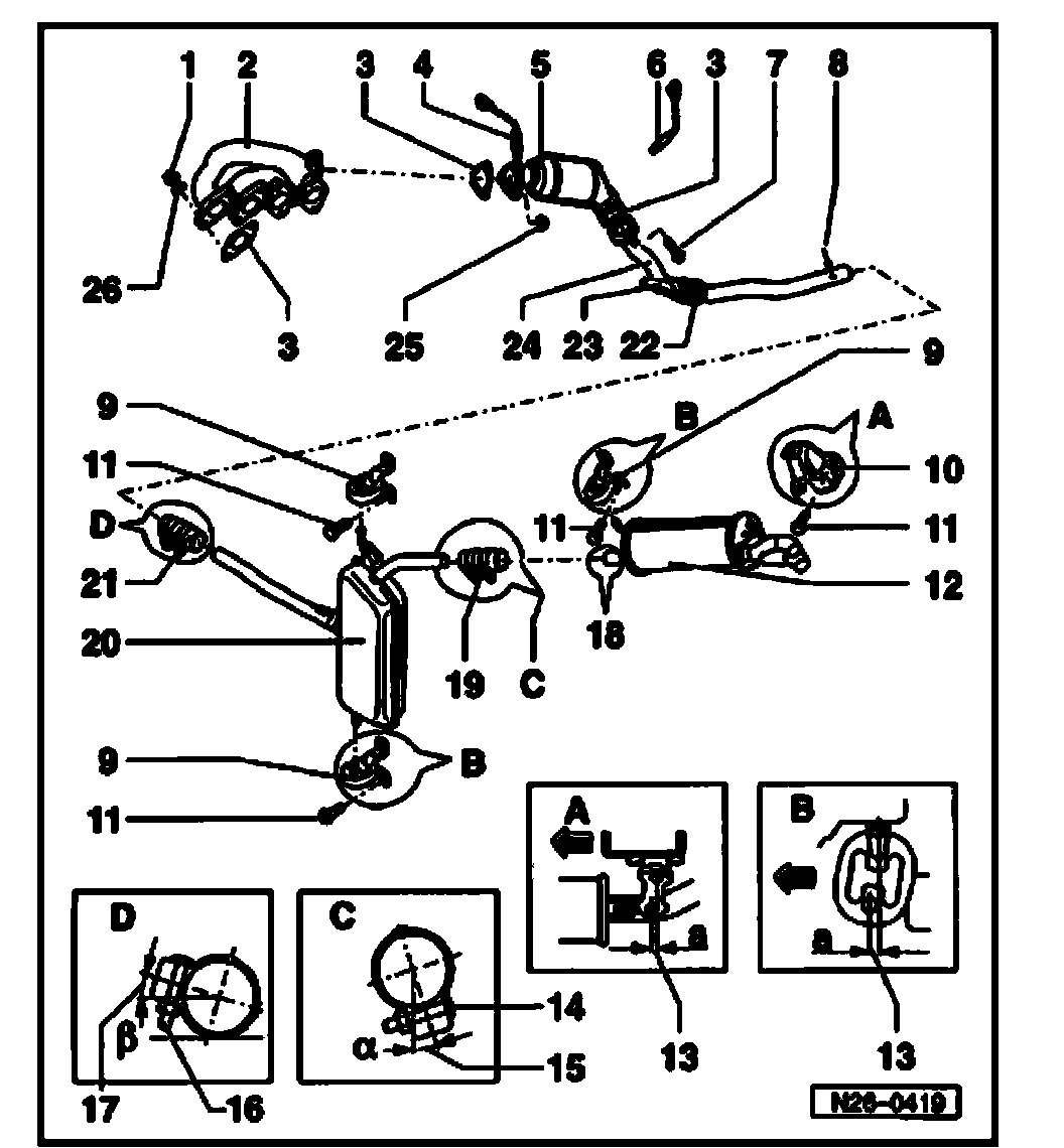 - After exhaust system repairs, make sure exhaust system is not under stress and that it has sufficient clearance from the bodywork. If necessary, loosen double clamps and align exhaust pipe so that sufficient clearance is maintained to the bodywork and mounts carry uniform loads.