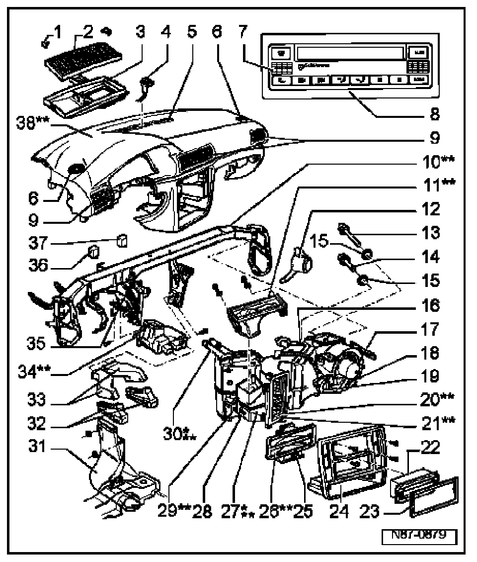- Climatronic control module -J255-, A/C control head -E87- and instrument panel interior temperature sensor -G56- with interior temperature sensor blower -V42- are integrated into a single unit and cannot be serviced separately.