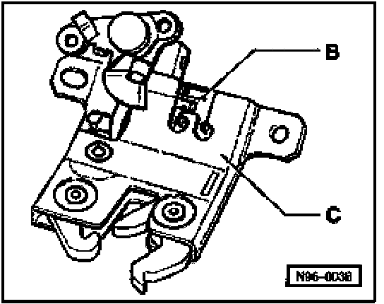 - Release luggage compartment light switch -B- from locating tabs and pull upwards from rear lid lock - C -.