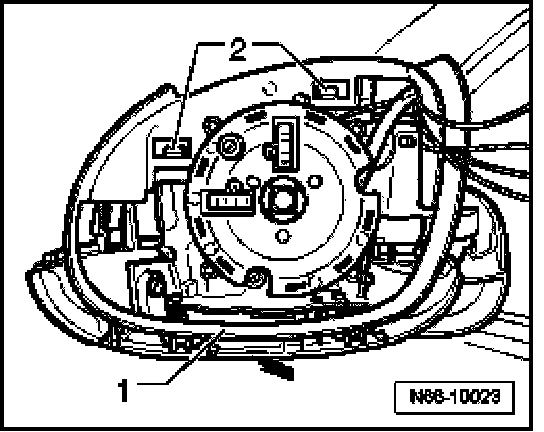 - Swivel mirror glass - 2 - to side - arrow 4 - and disconnect installed connector terminals - 3 - for electric dimming function (if installed) and mirror heater from rear side of mirror glass - 2 -.