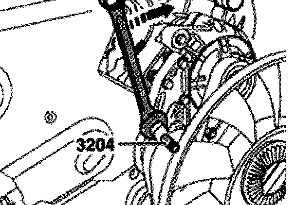 - Move tensioner in direction of arrow to release tension on ribbed belt.