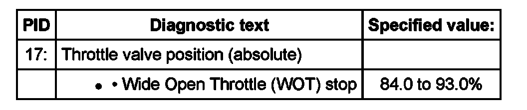 - Check specified value of throttle valve position (absolute) at Wide Open Throttle (WOT) stop: