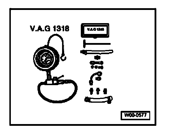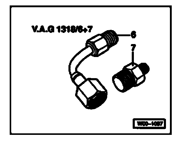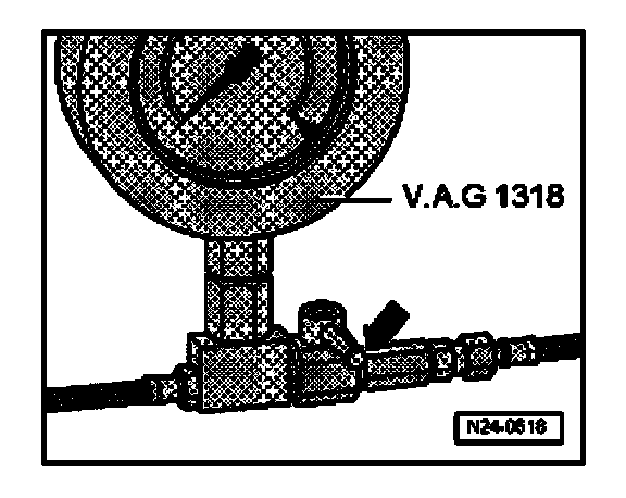 - Connect pressure gauge (VAG1318 using adapters VAG1318/6 and 1318/7) to supply line -1- and fuel distributor.