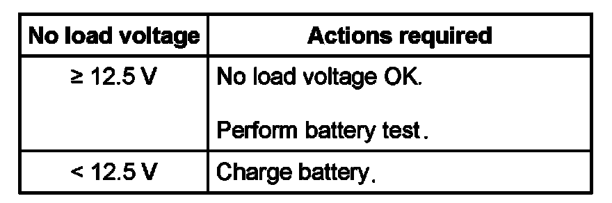 - No load voltage below 12.5 volts: Replace battery.