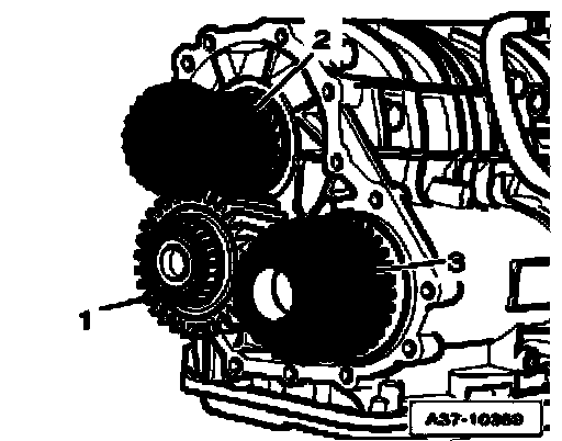 ^ Slowly and carefully remove intermediate flange for front final drive from transmission housing. The spur gears can otherwise fall out of the transmission.
