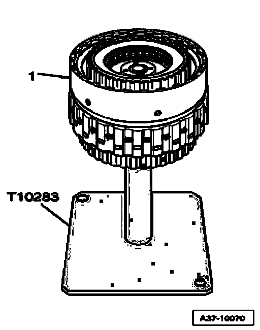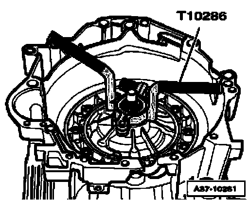 ^ Secure sun gear on input shaft without play, using assembly sleeve T10290, as depicted in illustration, thread stud screw - 1 - into bore identified by "A" - arrow A - and hand-tighten.