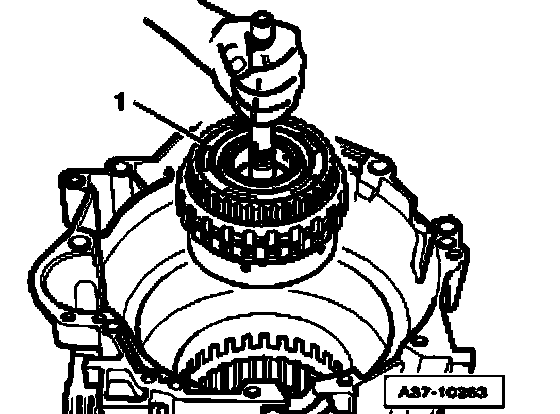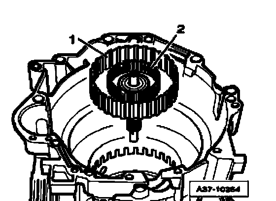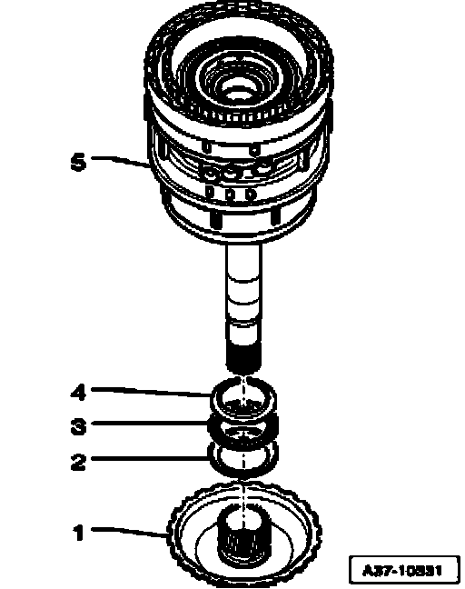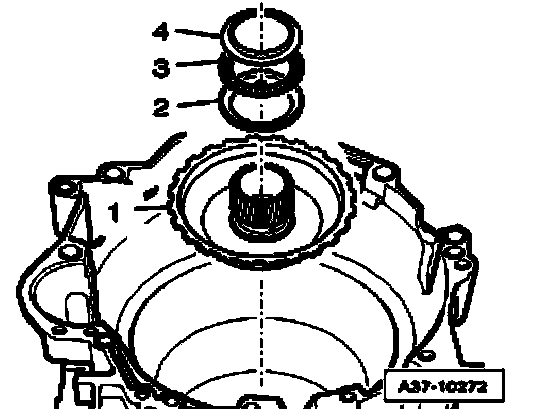 ^ Remove sun gear - 1 - with lower angle washer - 2 -, axial needle bearing - 3 - and upper angle washer - 4 - out of transmission housing.
