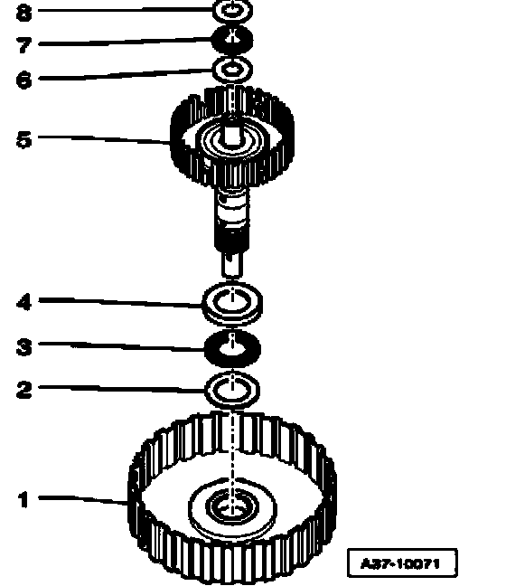^ Remove shaft with ring gear - 4 -, thrust washer - 3 -, axial needle bearing - 2 - and angle washer - 1 -.