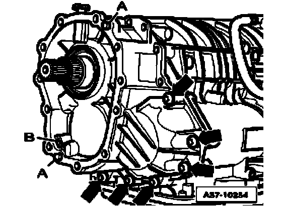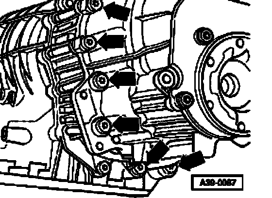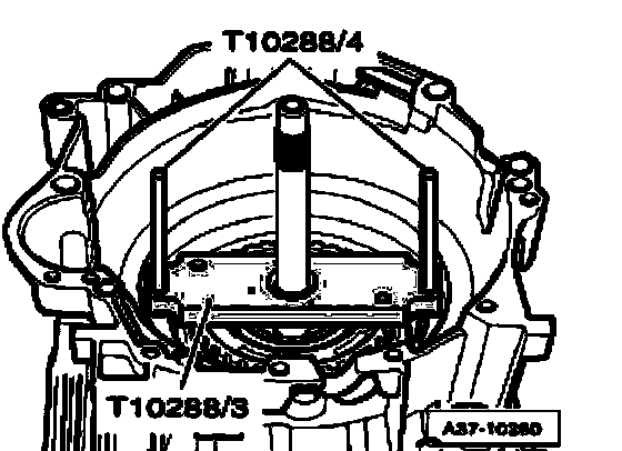 ^ Carefully remove centering tool T10288/3 upward, guide pins T10288/4 remain in transmission housing.